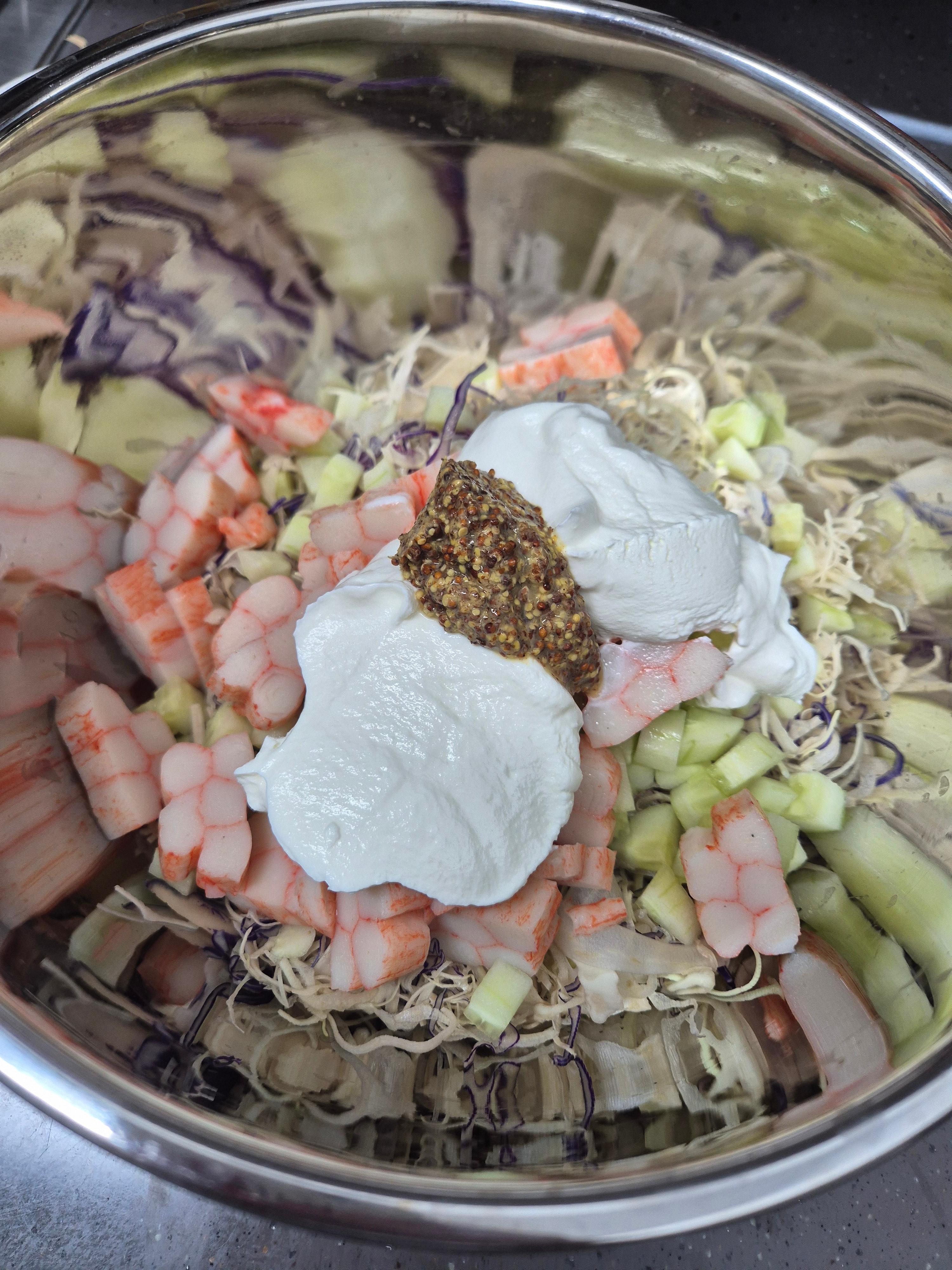 1. 재료 준비: 양배추, 오이, 크래미, 요거트 등
